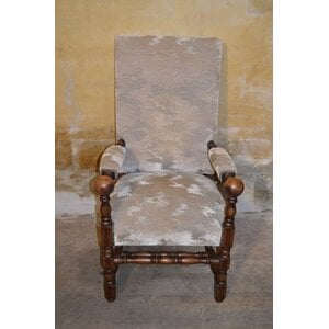 Mooie antieke eiken kasteelstoel met hoge rugleuning en velours bekleding. Chic herenmodel, tweedehands en met slechts minimale gebruikssporen.
