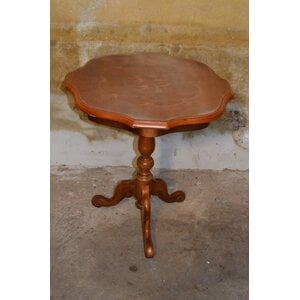 Stijlvol mahoniehouten bijzettafeltje met geschulpt blad, ingelegd bloemenmotief en gedraaide driesprantpoot. Decoratief en functioneel meubelstuk.