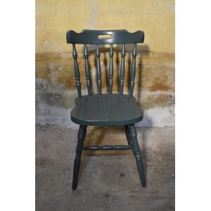 Ouderwetse houten keukenstoel in donkergrijs, met gedraaide poten en spijlen in de rugleuning. Tweedehands stoel met zichtbare gebruikssporen.