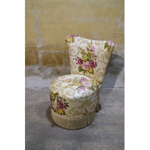 Charmant retro stoeltje uit de jaren 50 met satijnen bekleding en grote rozenprint. Dubbel functioneel als cocktail- en naaikist stoeltje.