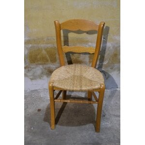 Fris Hollands eiken stoeltje uit de jaren 50 met vrijwel nieuwe biezen zitting. Zeer goede vintage staat met lichte gebruikssporen.