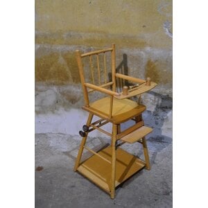 Leuke midcentury poppen- of kinderstoel uit de jaren 50. Kan worden omgeklapt tot laag stoeltje met tafeltje. Gebruikssporen, charmant vintage design.