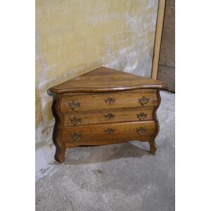 Een zeldzaam barok hoek buikkastje dat elke loze hoek karakter geeft. Met drie lades en messing grepen. Compact, elegant en opvallend. Gebruikssporen.
