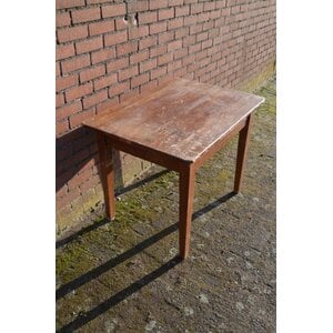 Stevige grenen eettafel met lade. Een praktische keukentafel die tegen een stootje kan. Met gebruikssporen, demontabele poten en een poot die nagekeken moet worden.