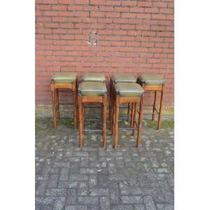 Set van zes eiken eetkamerstoelen uit de jaren 80 met groene stoffen zitting. Degelijke stoelen met een warme uitstraling. Hebben gebruikssporen en vragen wat stofwerk.