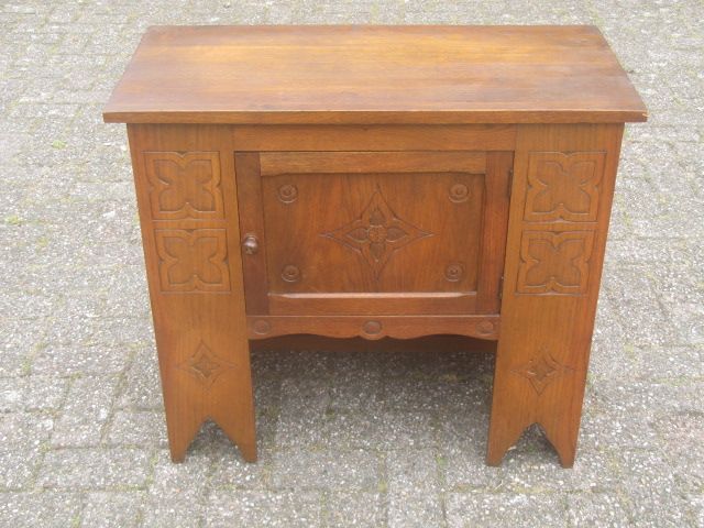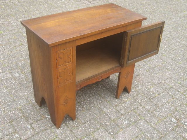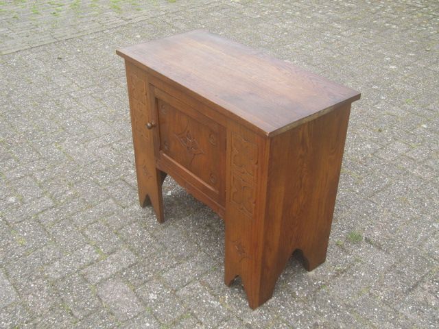Dit vintage eikenhouten kastje is een handig en sfeervol meubel met één rechtsdraaiend deurtje, versierd met klassiek houtsnijwerk. Door het massief eikenhout en de gebruikte staat heeft het kastje een warme, authentieke uitstraling. Ideaal als bijzetkastje of nachtkastje. Door de eerdere jaren van gebruik heeft het enkele gebruikssporen, wat bijdraagt aan de charme en het karakter van dit tweedehands meubel.