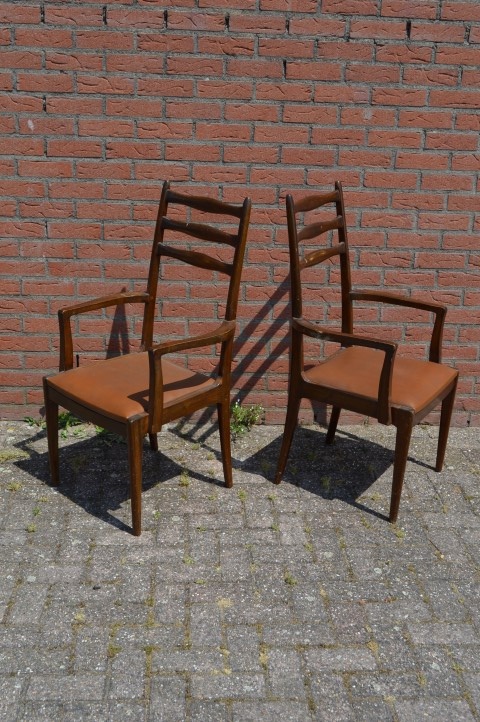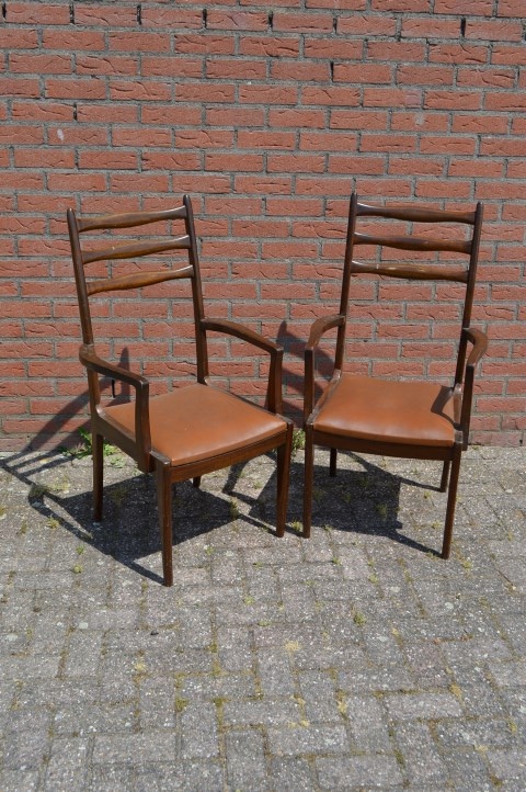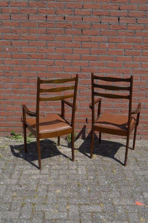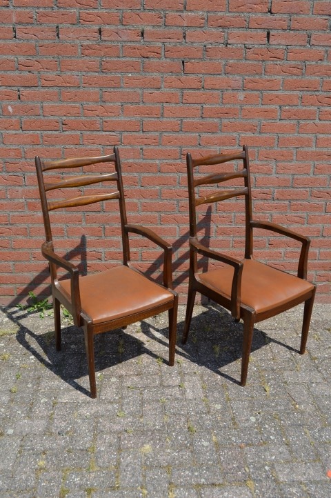 Twee vintage design mahonie houten armstoelen met leren bekleding op de zitting.