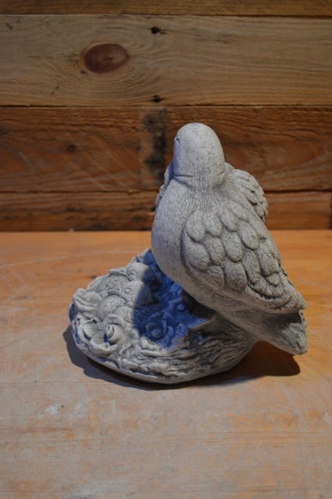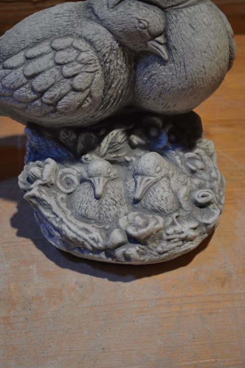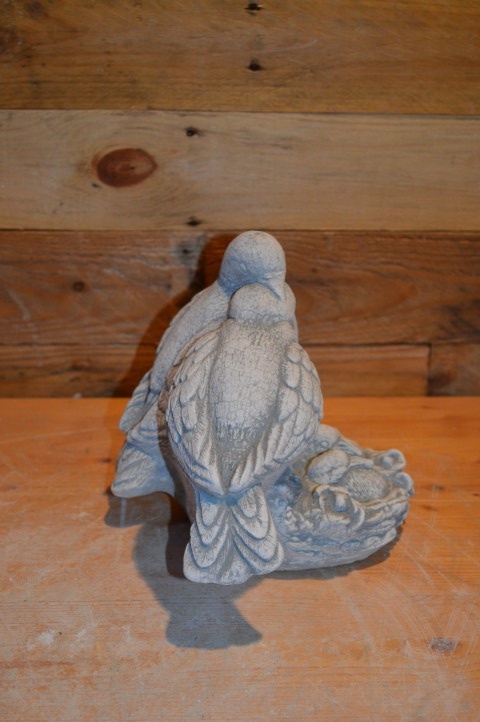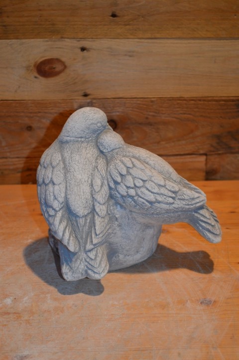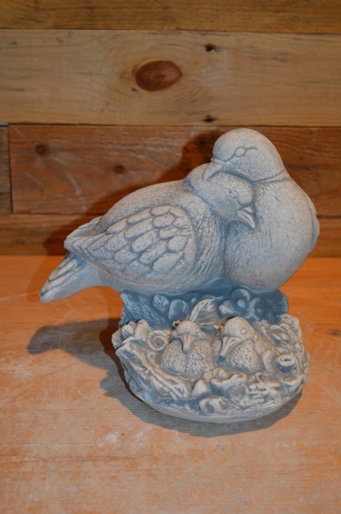 Duiven op nest met jongen is een prachtig en vertederend betonnen tuinbeeld van een duivenfamilie. Vader en moeder duif waken liefdevol over hun jonge duifjes in een fraai vormgegeven nest. Dit beeld straalt rust, verbondenheid en zorgzaamheid uit – ideaal voor een stil hoekje in de tuin, op een gedenkplekje of als symbolisch siervoorwerp. Gemaakt van duurzaam beton (ook wel gietsteen genoemd), geschikt voor elk seizoen.
