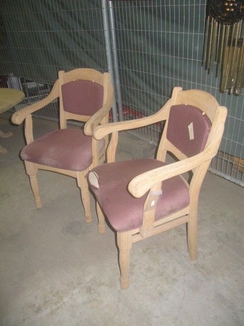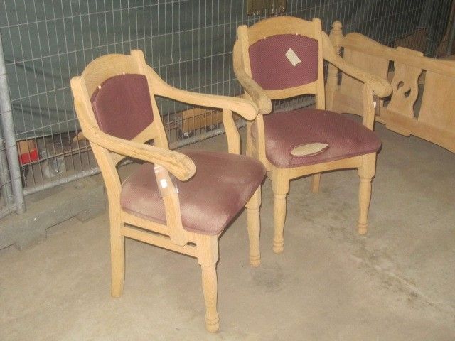 Set van 2 brocante eiken armstoelen. Blank gestraald en klaar om naar eigen smaak af te werken en opnieuw te bekleden. Comfortabel in woonkamer, serre of slaapkamer.