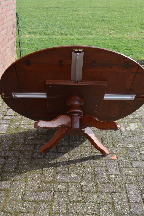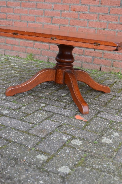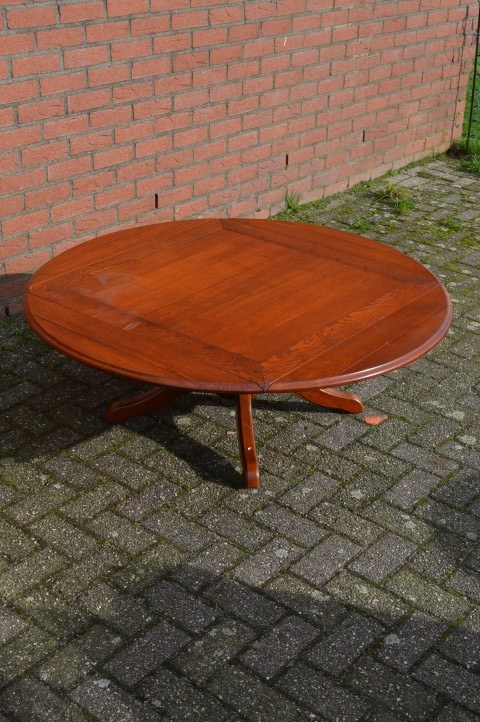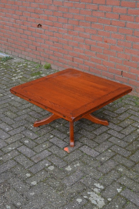 Fantastische massief eiken salontafel die zowel vierkant als rond is. De ronde kanten schuiven / klappen onder het bovenblad van de tafel waardoor het een vierkante tafel wordt. Magic zullen de kleinkinderen roepen, een tovertafeltje waar men veel plezier van kan hebben.