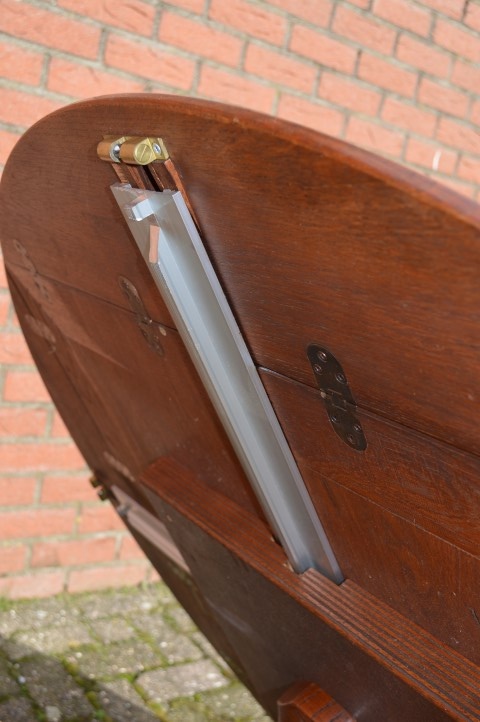Het is een tweedehands tafeltje met gebruikssporen zoals vlekken op blad en 1 van de ondersteunijzer schuift moeilijk.