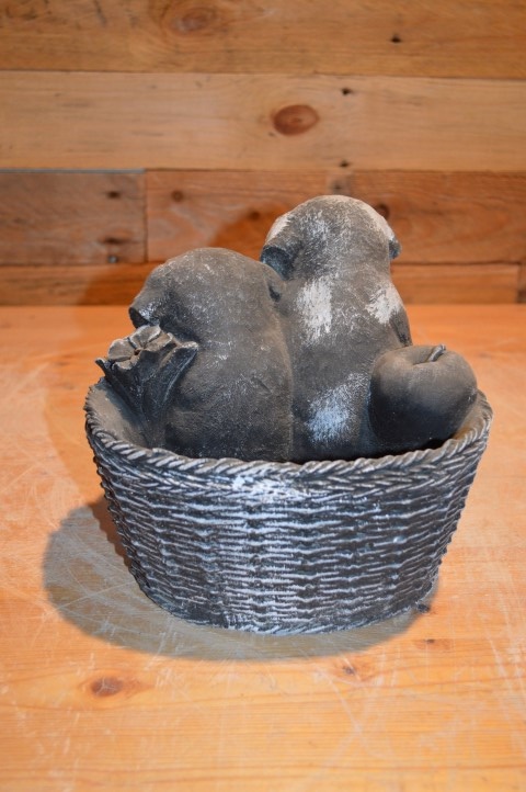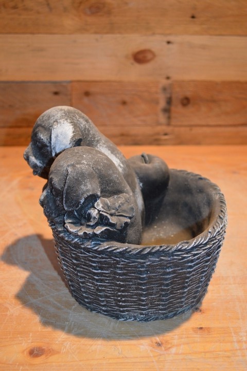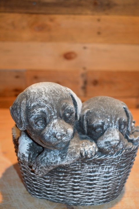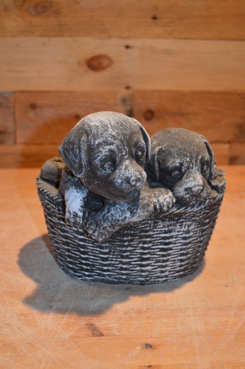 Puppy’s in plantenbakje is een charmant en decoratief beeld van twee spelende hondjes die zich genesteld hebben in een plantenbakje van beton. Dit vrolijke showmodel is ideaal voor binnen op de vensterbank of buiten op het terras of in de tuin. Het beeld is geschilderd in een geleefde kleur, wat zorgt voor een authentieke, warme uitstraling. Gemaakt van stevig gietsteen (beton), dus weerbestendig en duurzaam. Een schattige eyecatcher die sfeer brengt op elke plek.