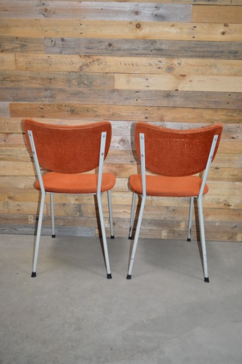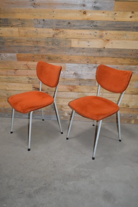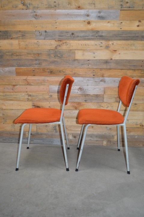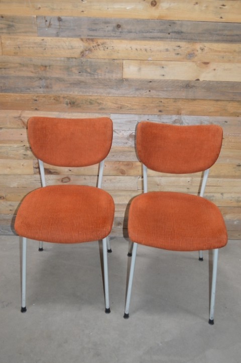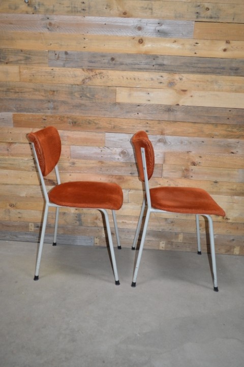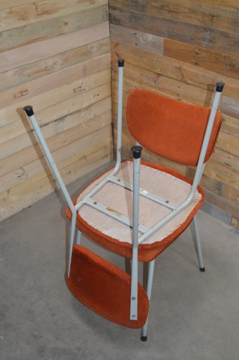 Het zijn retro stoelen die veel gebruikt zijn en daardoor gebruikssporen hebben opgelopen. De vulling van de rugleuning en zitting is vergaan onder de stof en zal vernieuwd moeten worden.
