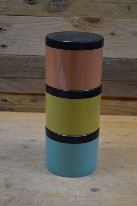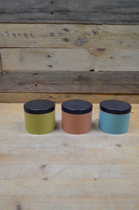 Set van 3 handige retro bewaarblikjes van gekleurd plastic. Deze bakjes zijn ideaal voor in de keuken en passen dankzij de vrolijke kleuren overal goed bij.