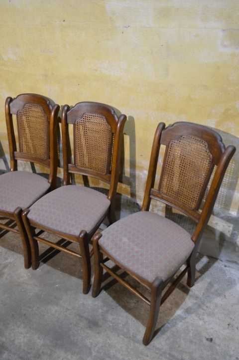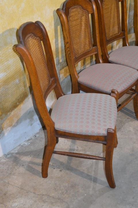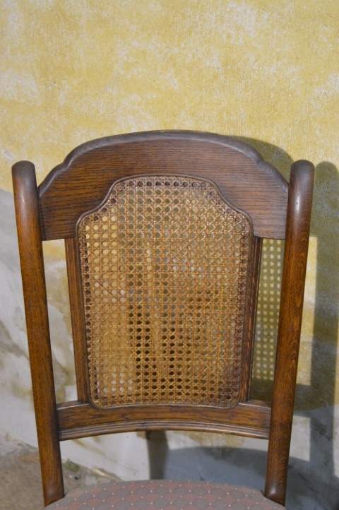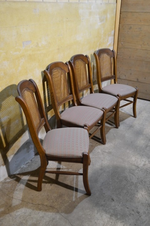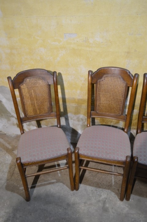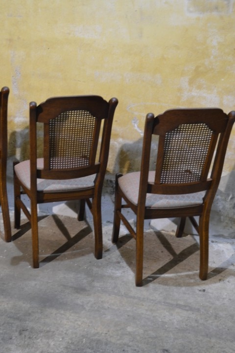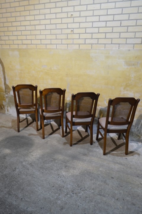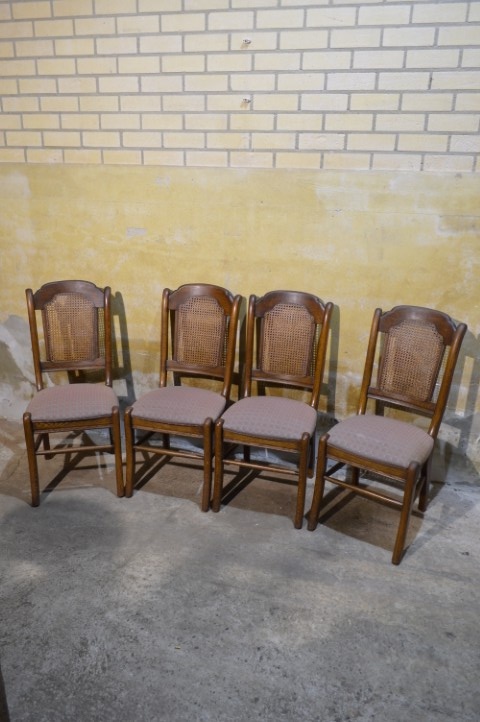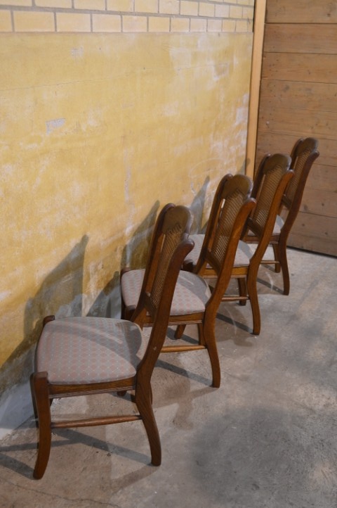 Set van 4 brocante eiken eetkamerstoelen met webbing en meerkleurige zitting. De combinatie van massief eikenhout, webbing in de rugleuning en speelse bekleding geeft deze stoelen een warme, geleefde uitstraling. Deze retro stoelen vertonen gebruikssporen en vlekken in de stof, passend bij de leeftijd. Herstofferen is mogelijk, maar in huidige staat zijn ze perfect voor een brocante, landelijke of vintage inrichting.