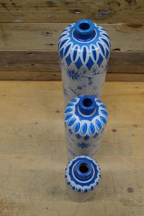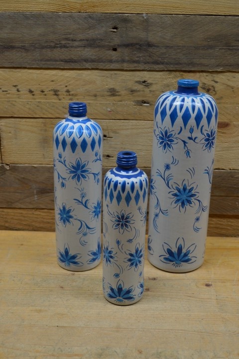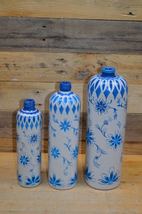 Handbeschilderde aardenwerk kruiken met verschillende inhoud. Deze mooie set van 3 vintage kruiken in een grijs getinte ondergrond met blauwe korenbloemen erop geschilderd. De decoratieve kruiken van keramiek zijn beschilderd met bloemen en andere motieven en zijn ideaal als toevoeging aan een lege vensterbank of een leuke kast of tafel.