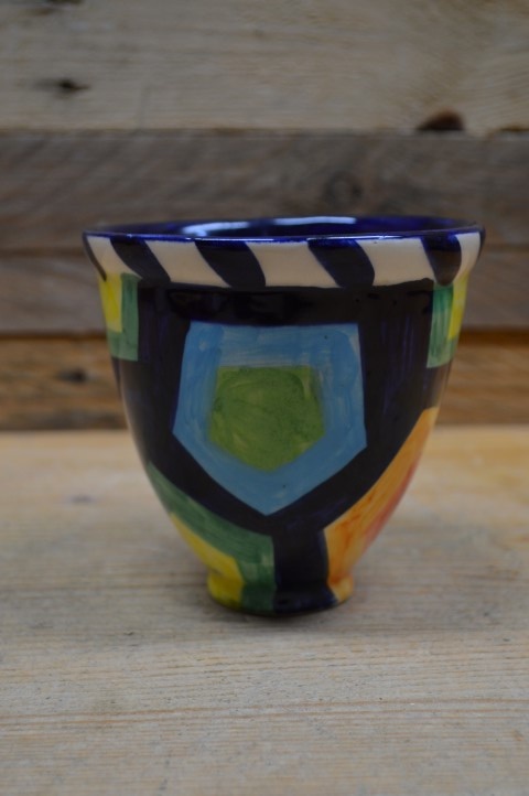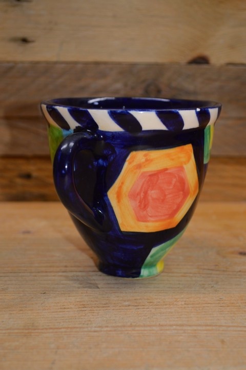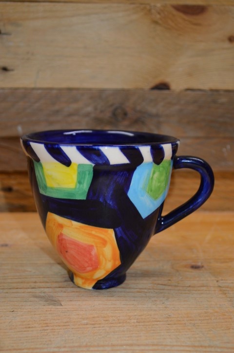 Protest mok Ikea, ontworpen door Åsa Grey in 1998 . Blauwe mok in een royaal formaat, met een mooi kleurrijk patroon blauw, geel, groen, oranje en geometrische vormen die doen denken aan de Memphis Milano stijl. Het materialen is handbeschilderd geglazuurd keramiek.