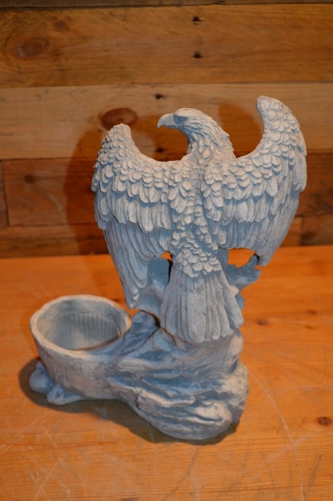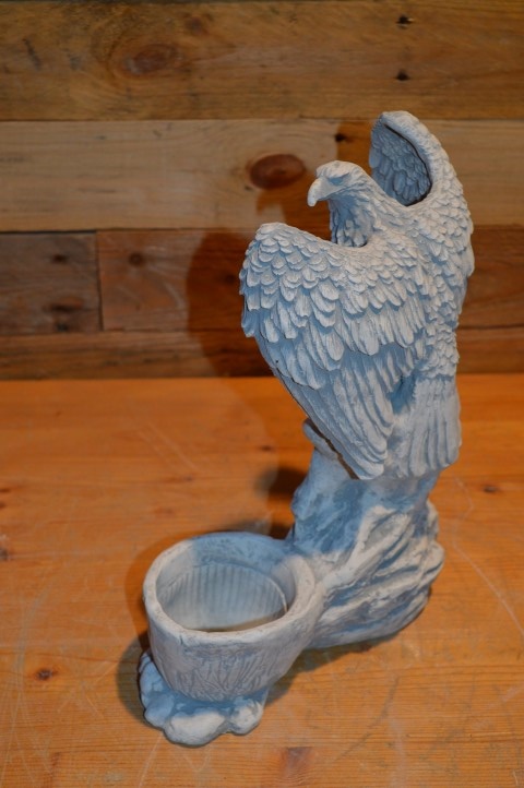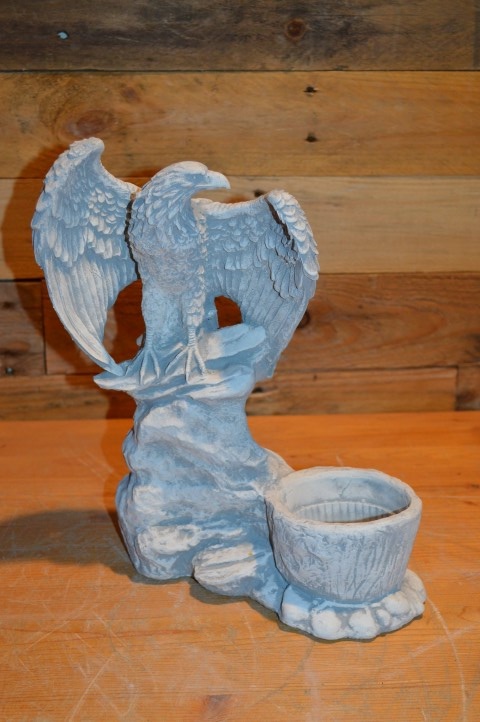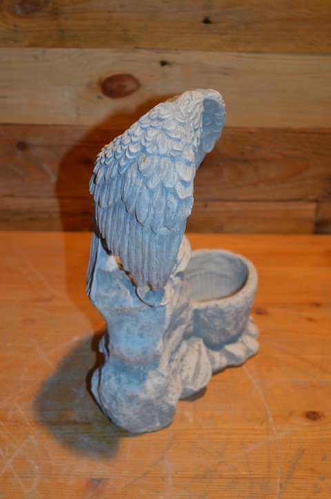 De adelaar met bloempotje is een indrukwekkende verschijning. Met zijn gespreide vleugels zit hij krachtig op een rots, naast een klein bloempotje waarin u een plantje kunt zetten. Dit stevige betonnen beeld combineert de majestueuze uitstraling van een roofvogel met de charme van een decoratief plantenbakje. Geschikt voor gebruik in huis, op het balkon of als eyecatcher in de tuin.