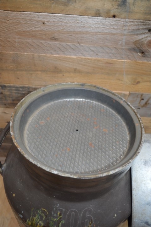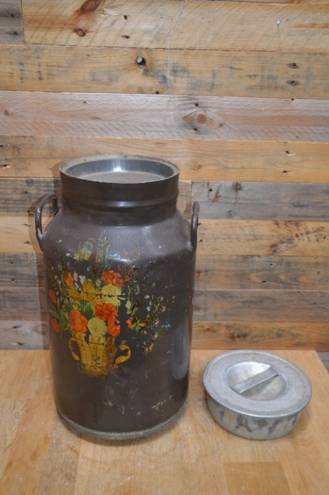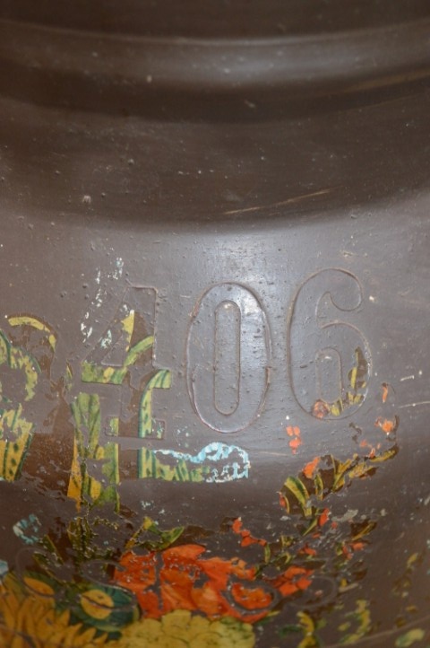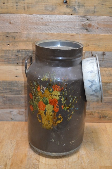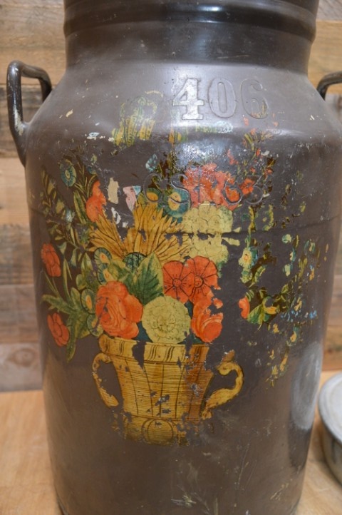 Deze aluminium melkbus vintage heeft een inhoud van 25 liter en draagt het ingeslagen nummer 406. De bus is beschilderd en beplakt met bloemmotieven. Door de leeftijd vertonen de beschildering en beplakking duidelijke gebruiks- en slijtagesporen. Een mooi verzamelobject of decoratief item voor liefhebbers van oude gebruiksvoorwerpen.