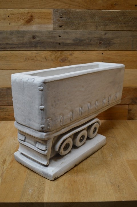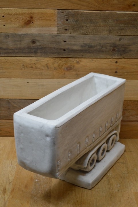 Deze Amerikaanse trailer plantenbak is een schitterend betonnen tuinbeeld in de vorm van een vrachtwagenaanhanger. De oplegger is met zorg gedetailleerd en kan dienst doen als bloembak, maar ook zonder beplanting is het een prachtige decoratie. De trailer past bovendien perfect achter één van de betonnen trucks die elders op de site te vinden zijn. Zowel als solitair tuinbeeld of als onderdeel van een groter geheel is dit een opvallend object voor tuin of terras.