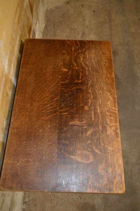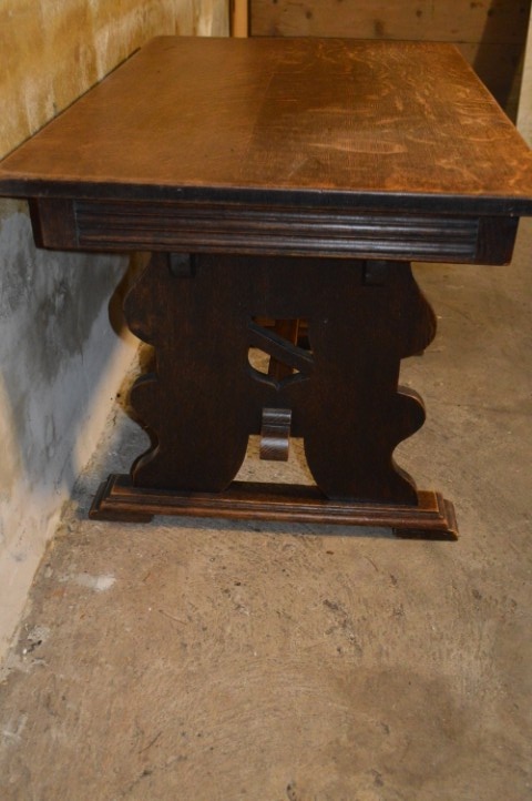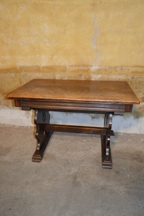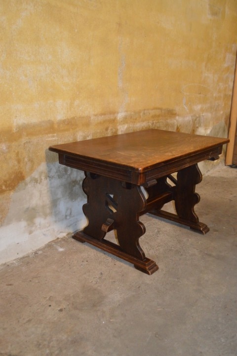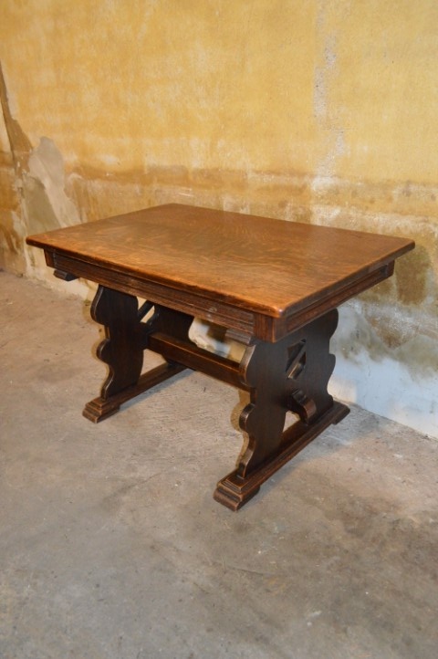 Dit compacte tafeltje combineert stevigheid met sierlijke details. De sledes met daarop de brede poten onder het omrande blad geven het meubel een solide basis, terwijl de verhoudingen het geheel licht en elegant houden. Perfect te gebruiken als salontafel, maar ook zeer geschikt als bijzettafel of decoratief accent in een hal, slaapkamer of zithoek. Het eikenhout heeft in de loop der jaren een mooie, natuurlijke patina ontwikkeld. Gebruikssporen passend bij de leeftijd zijn aanwezig en versterken juist het authentieke karakter. Een uniek antiek stuk – daar is er maar één van.