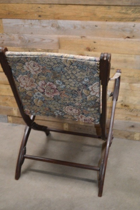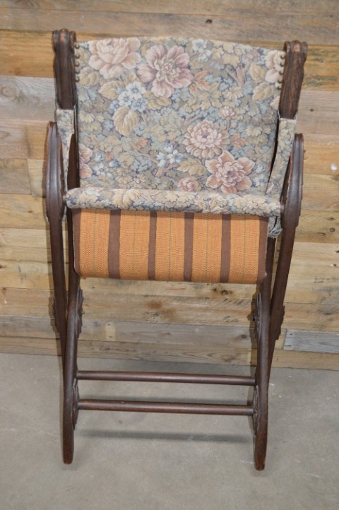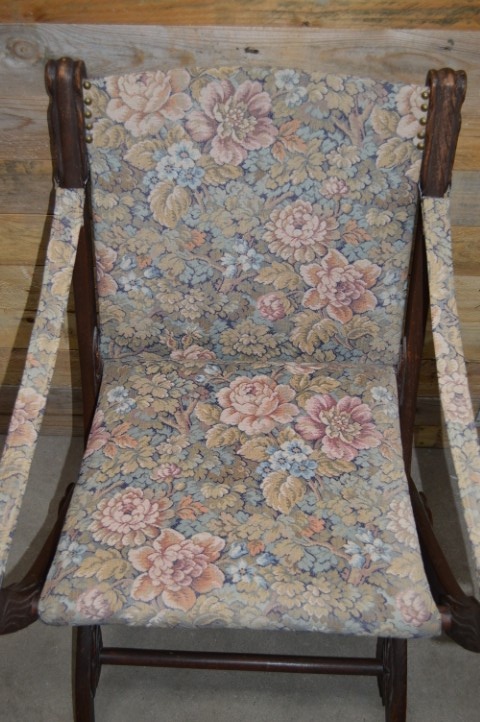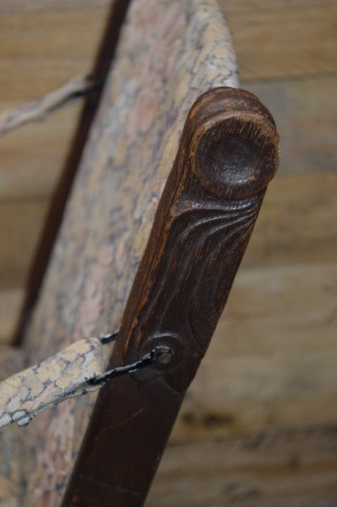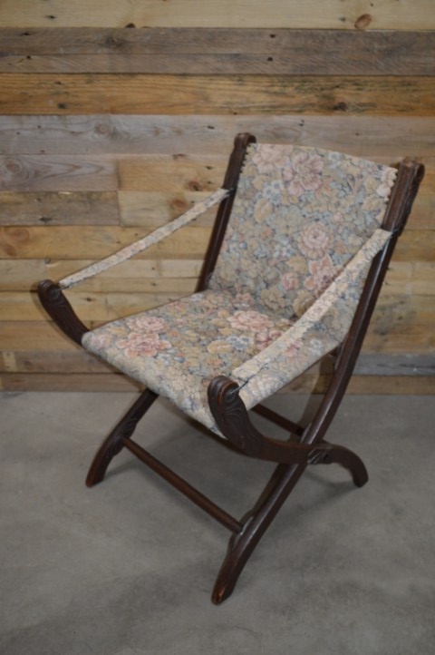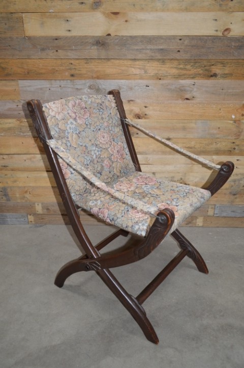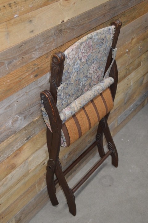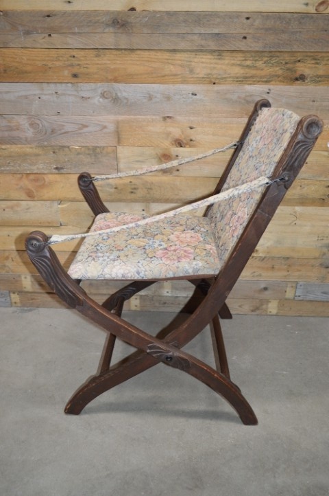 Unieke antieke Franse klapstoel. Het oude eikenhout waarvan het frame gemaakt is, is versierd met sierlijke, doch niet uitbundige, houtsnijwerkjes. De jute zitting en de rugleuning zijn bekleed met kleurrijke bloementjes stof. De gebogen poten van het frame hebben een net iets andere vorm dan de meeste antieke klapstoelen hebben waardoor het een uniek tuinstoeltje is die natuurlijk ook perfect binnen gebruikt kan worden.