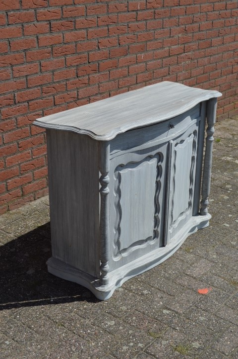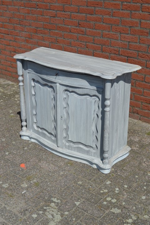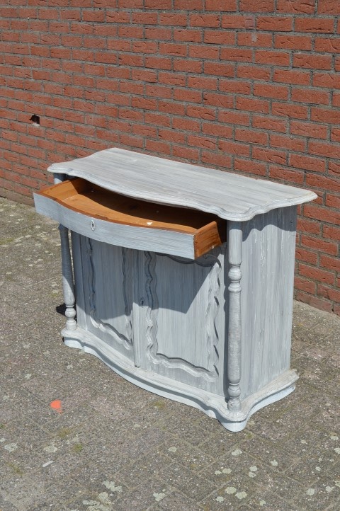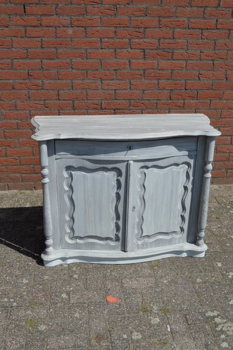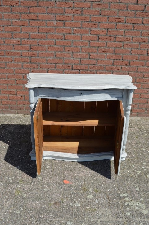 Mooi sierlijk antiek penantkastje. Hele mooie antieke Biedermeier kast uit ongeveer 1900. De fijne diepe lade en de 2 deurtjes hebben een prachtig gebogen front erachter zit veel opbergruimte. Leuk ook als commode. Door de vorige eigenaar is deze kast wit grijs geschilderd.