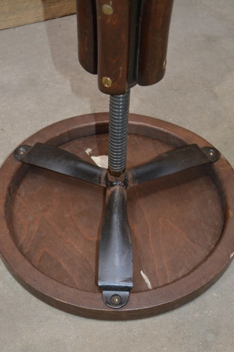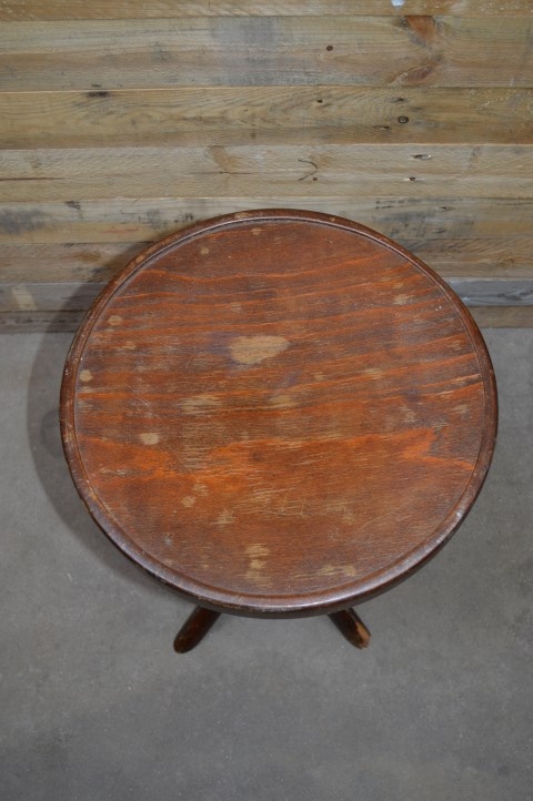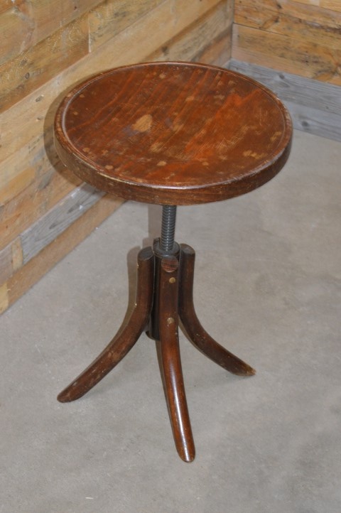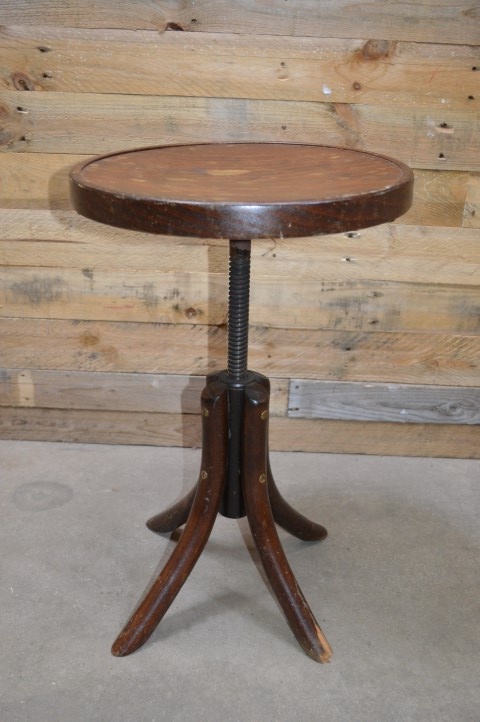 Antiek rond draaikrukje van hout met gebogen poten toegeschreven aan Thonet maar deze krukken zijn ook gemaakt door andere bedrijven. Draaibare pianokruk vaak gebruikt door pianisten. De zitting van deze stoel is in hoogte verstelbaar door middel van een spindel die eveneens draaibaar is. Vaak worden krukjes als deze als plantentafeltje gebruikt.