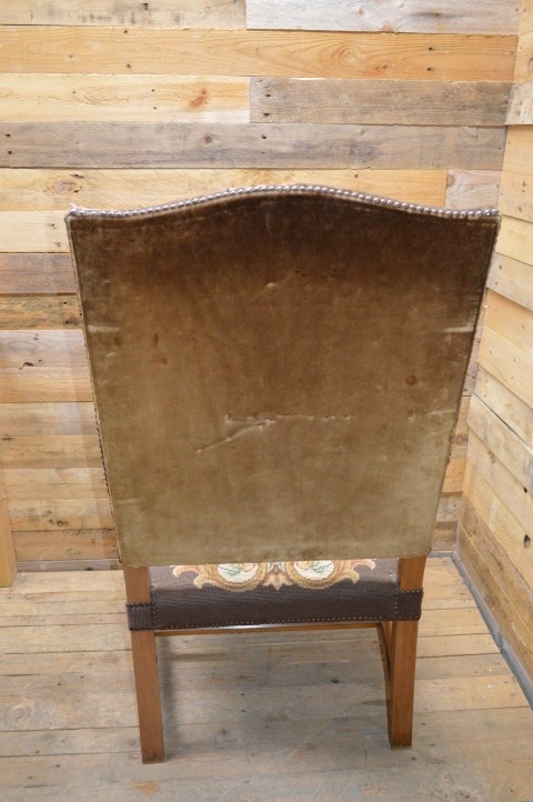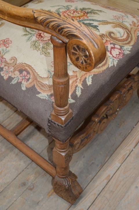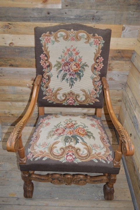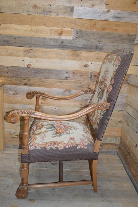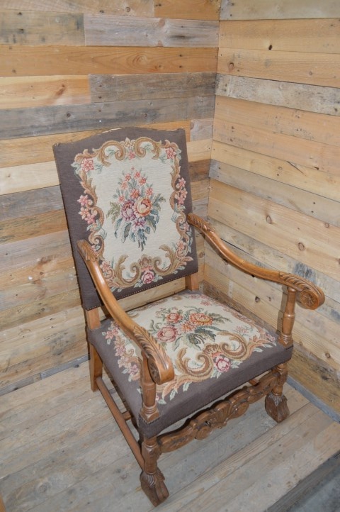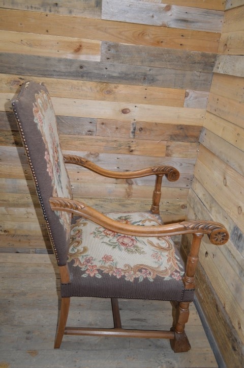 Heel mooie antieke Hollandse stoel met houtsnijwerk en een tapisserie en petit point. Een armstoel voor bij de haard of op een plekje waar je heerlijk een uurtje rustig kan lezen of borduren.