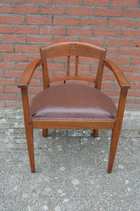 Eikenhouten herenfauteuil uit de jaren 20 met leren zitting en uitgesneden wapenschild in de rugleuning. Stijlvol meubel met lichte gebruikssporen.