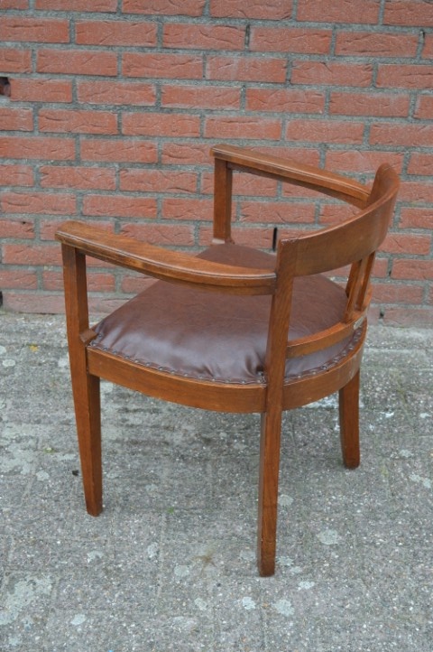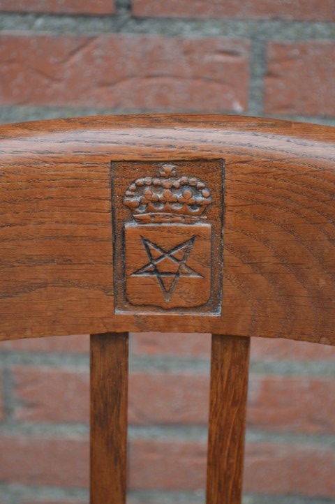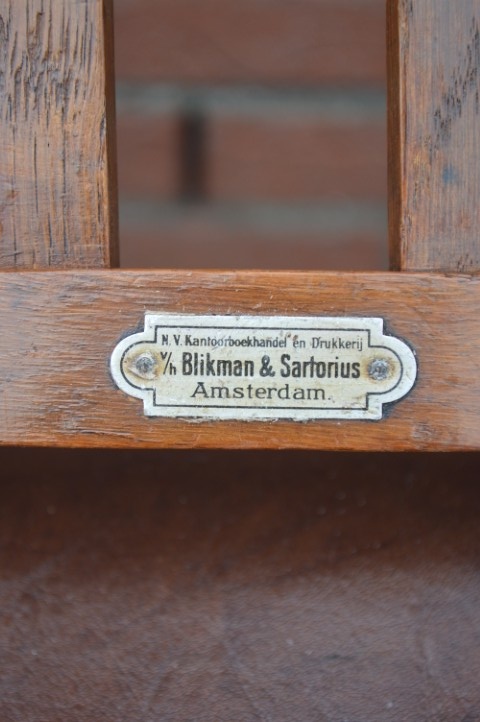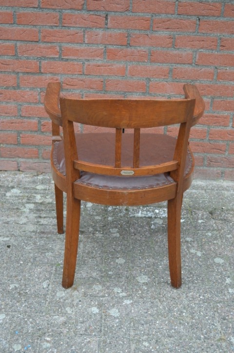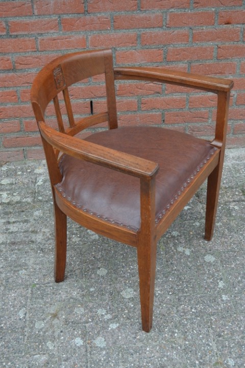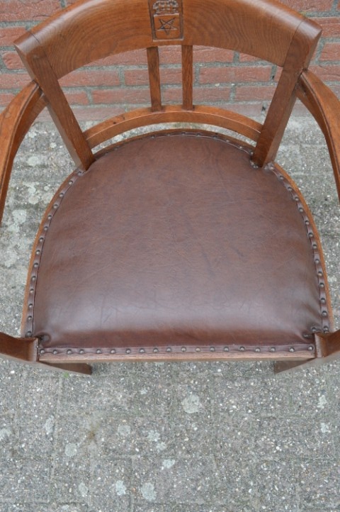 Een prachtig meubelstuk met geschiedenis: deze antieke eiken armstoel uit de jaren 20 is een herenfauteuil met een uitgesproken karakter. In de rugleuning is een wapenschild met pentagram uitgesneden — een bijzonder detail dat deze stoel uniek maakt. De leren zitting en stevige eiken constructie stralen kwaliteit uit. Gemaakt voor de Amsterdamse kantoorboekhandel en drukkerij v/h Blikman & Satorius. Ondanks lichte gebruikssporen verkeert deze stoel in mooie vintage staat en past hij perfect in een klassieke studeerkamer of herenkamer.