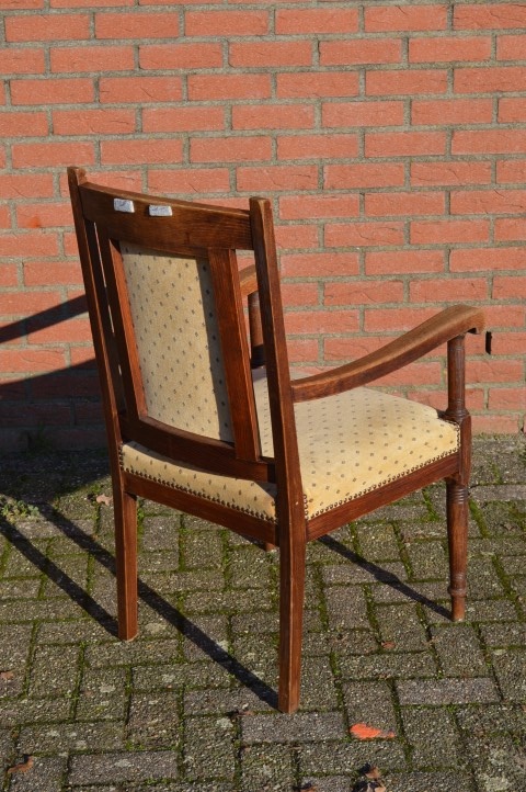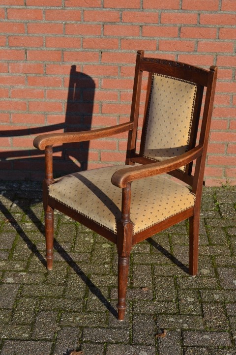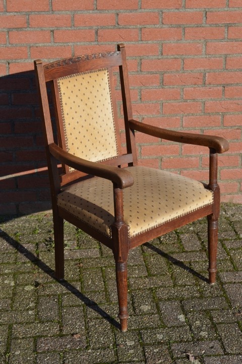 Heel mooie antieke Hollandse stoel met subtiele versieringen in het eikenhout. De zitting en rugleuning zijn bekleed met stof. Een armstoel voor bij de haard of op een plekje waar je heerlijk een uurtje rustig kan lezen of borduren.