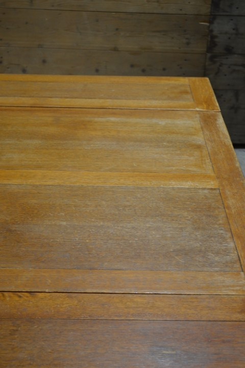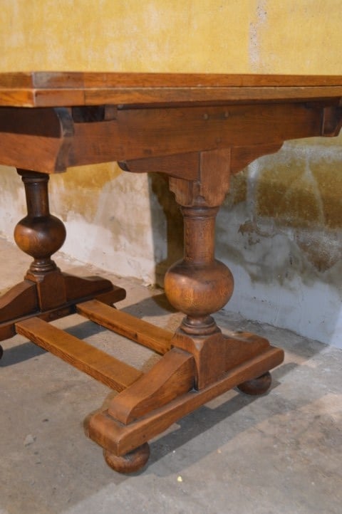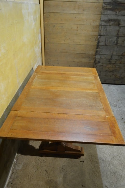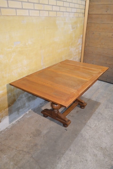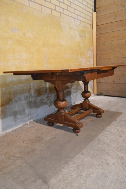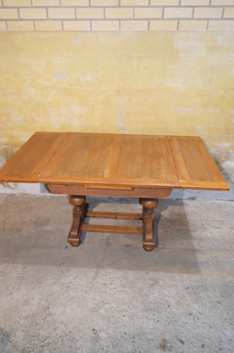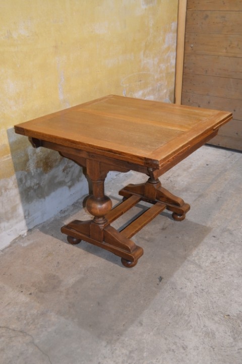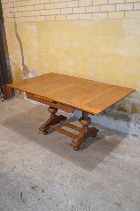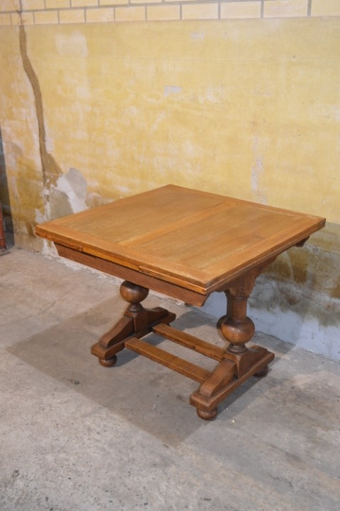 Deze vierkante eiken eettafel uittrekbaar is een bijzonder en zeldzaam exemplaar uit circa 1939. De tafel is deels uitgevoerd in massief eikenhout het blad is gefineerd. Het geheel rust op een karakteristieke H-vormige dwarsbalk met twee robuuste zuilen. Deze zuilen zijn fraai afgewerkt met gedraaide balusters en verfijnd gegroefd snijwerk, wat de tafel een klassieke en ambachtelijke uitstraling geeft.
