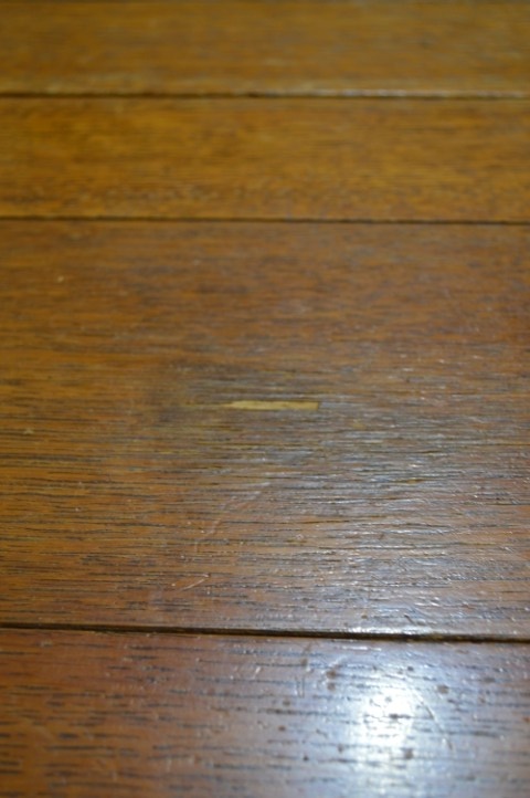 De tafel verkeert in mooie originele staat met zichtbare gebruikssporen die passen bij de leeftijd. Het blad is deels gefineerd en mist een klein stukje fineer, wat het authentieke karakter onderstreept.