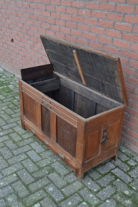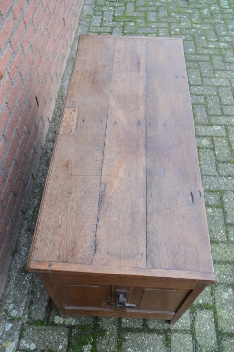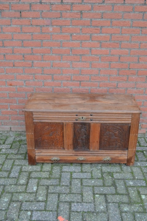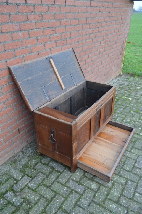 Een robuuste eiken kist uit het begin van de 19de eeuw. De afmetingen van deze kist zijn bescheiden en hij heeft een praktische, platte deksel. Een bruidskist zoals deze was het eerste meubelstuk dat vroeger gebruikt werd in huis. Deze dekenkist is gemaakt van eikenhout en heeft een prachtig doorleefd patina. Mooi robuuste handgrepen in de frontpanelen houtsnijwerk. Opmerkelijk is dat onderin de kist een lade over de volle breedte is. De vorm van de kist maakt het prima mogelijk om hem als salontafel of bijzettafeltje te gebruiken. In de zijkant van de kist is een monogram aangebracht.