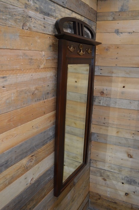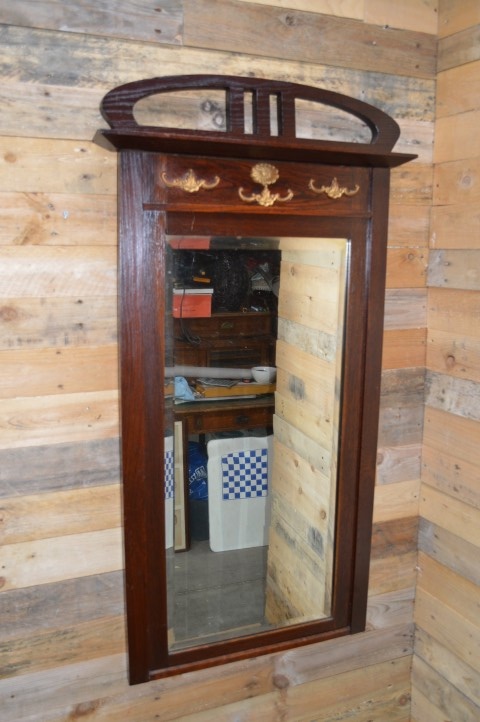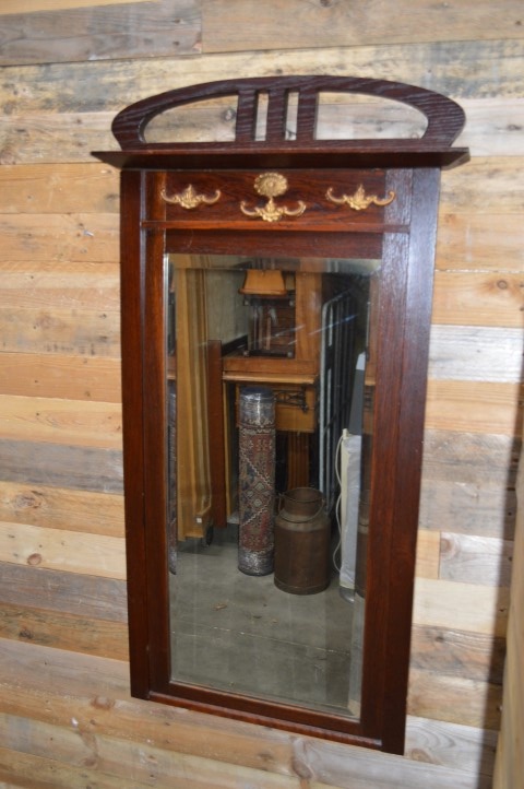 De spiegel heeft gezien en geleefd — en dat is terug te zien in wat gebruikssporen. De achterwand moet opnieuw vastgezet worden en het spiegeloppervlak vertoont enkele weerplekjes. Maar juist dat maakt deze oude spiegel zo charmant en uniek.