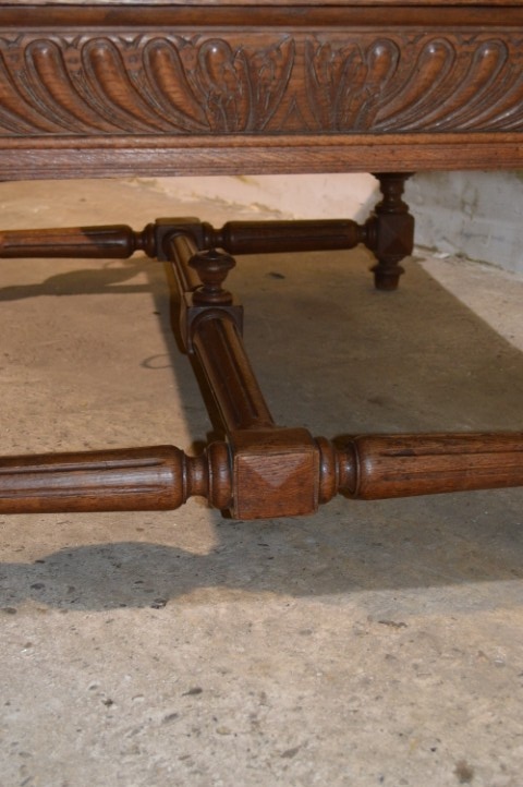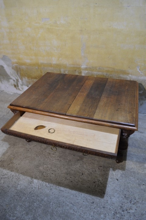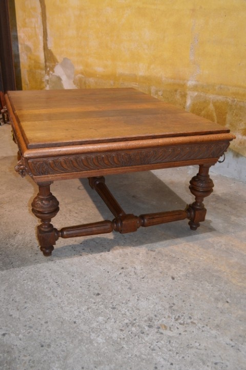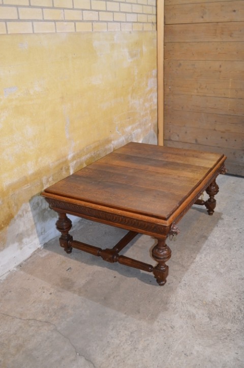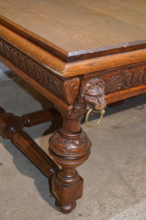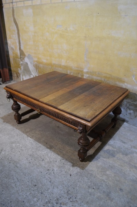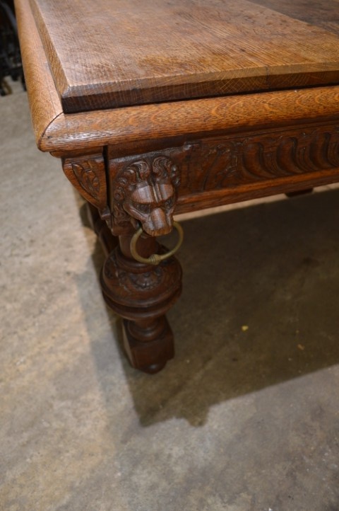 Deze antieke Franse eiken salontafel dateert van rond 1880 en is rijk uitgevoerd met decoratief snijwerk en karakteristieke leeuwenkoppen.