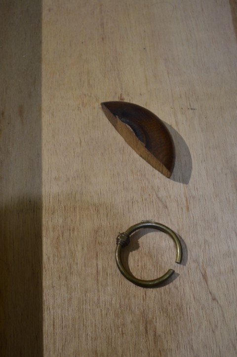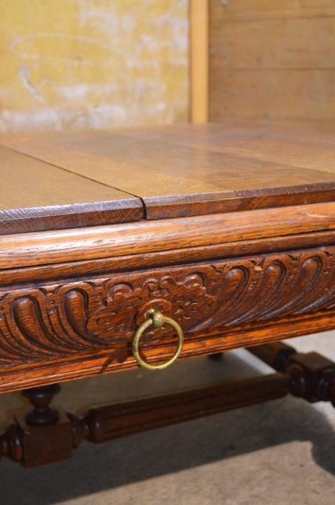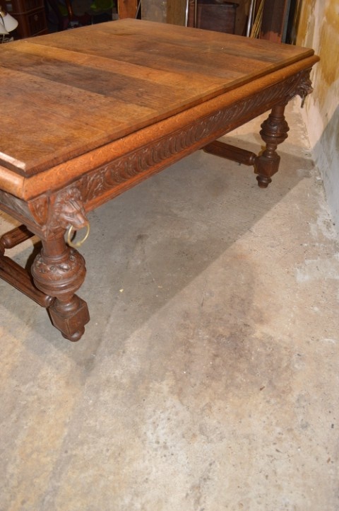 De tafel is tweedehands en vertoont gebruikssporen, waaronder kleine beschadigingen in het hout. Eén van de ringen bij een leeuwenkop dient opnieuw geplaatst te worden nadat de kop is gelijmd.