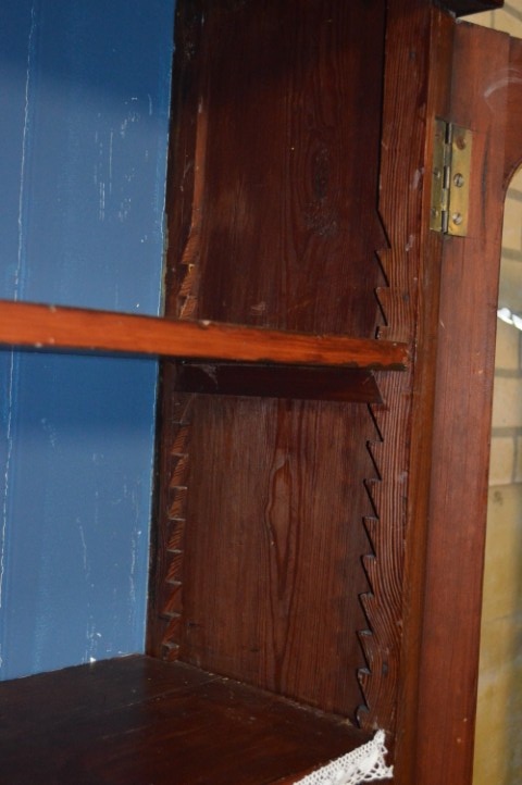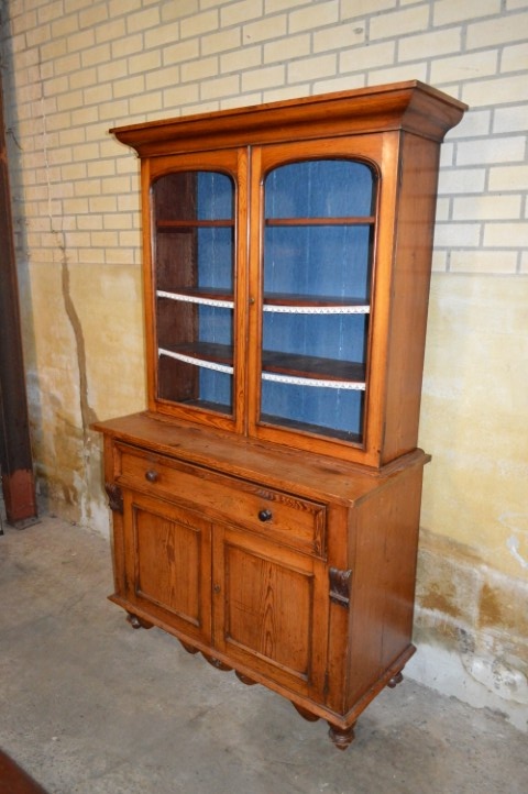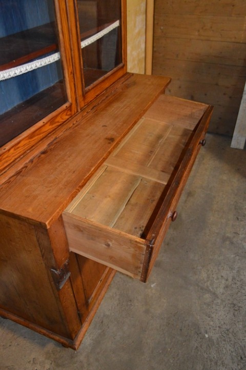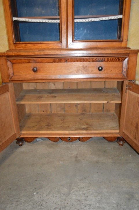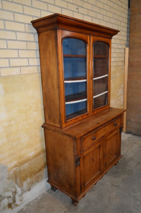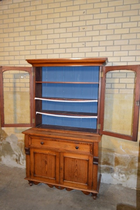 Deze prachtige tweedelige kast is vervaardigd uit massief grenenhout en ademt vakmanschap. De subtiele eenvoud in vormgeving geeft het geheel een tijdloze uitstraling, terwijl de fijne afwerking de kwaliteit van begin 20e eeuw laat zien. De bovenkast beschikt over drie planken achter glas, waarvan twee nog zijn afgewerkt met een handgehaakt randje – een charmant detail dat zelden nog voorkomt. In de onderkast vindt u een ruime lade en een afgesloten kastruimte met plank, ideaal voor servies, linnengoed of voorraad. De kast bestaat uit twee delen, wat het transport vergemakkelijkt. Een duurzaam, uniek meubelstuk van ruim een eeuw oud – en daar is er maar één van.