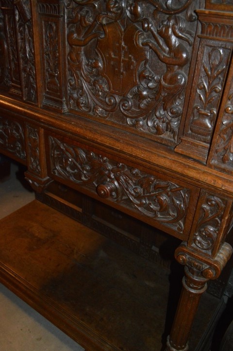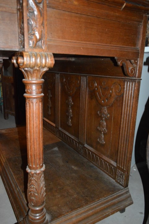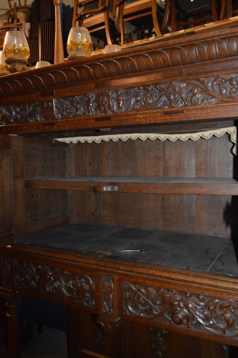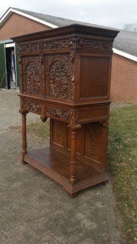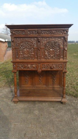 De kast is één geheel met in het midden twee grote lades en bovenin twee deuren met een schap erachter. Het neoclassicistische ontwerp en de uitstekende staat maken dit een echte blikvanger in elk interieur. Goed onderhouden en klaar om een prominente plek in je huis te krijgen.