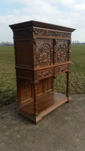 Op zoek naar een stijlvol en uniek meubelstuk? Deze antieke Hollandse rozenkast uit circa 1920 trekt direct de aandacht door het rijke handgesneden houtsnijwerk.