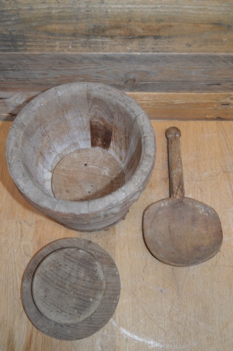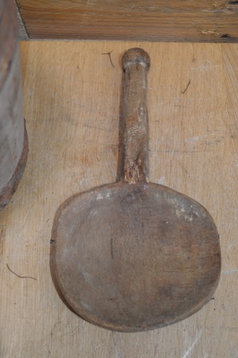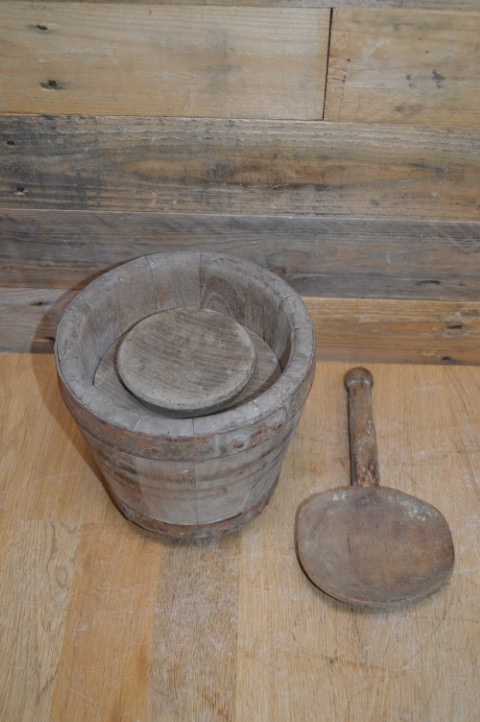 Bijzonder aan dit exemplaar is dat ook de originele houten platte lepel bewaard is gebleven, waarmee de wrongel in de mal werd geschept. Het hout toont gebruikssporen, maar is behandeld tegen houtworm. Een prachtig en authentiek verzamelobject voor liefhebbers van antiek en agrarisch erfgoed.