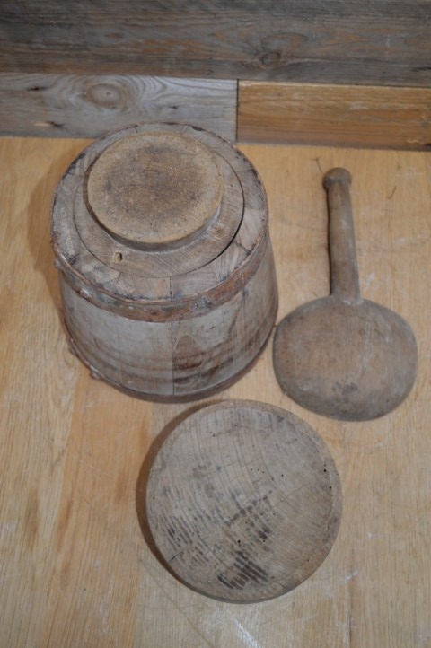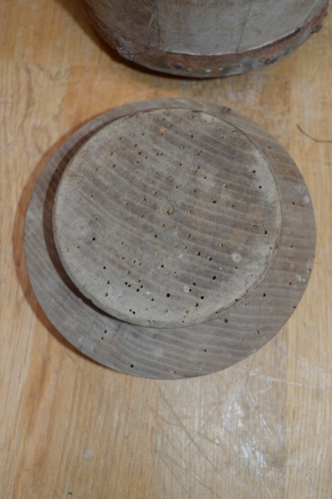 Een uniek stuk kaasgeschiedenis: deze antieke houten kaaskop is volledig compleet met originele lepel en deksel.