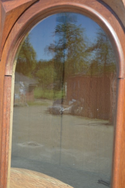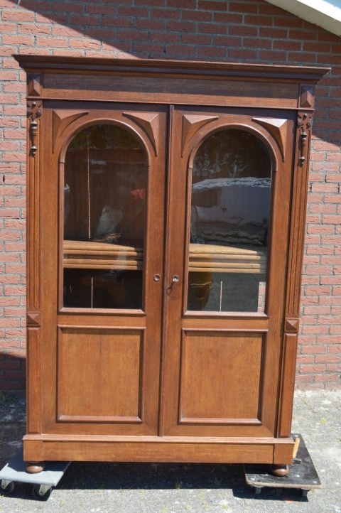 Antieke servieskast uit de vroege jaren van de vorige eeuw met oud glas in de deuren. Een glazenkast met schappen om het servies op te zetten. De onderste schappen van deze vitrinekast zijn met de deuren dicht onzichtbaar waardoor ook andere items dan glazen en servies erin gezet kan worden. De schappen zijn goed in hoogte verstelbaar.