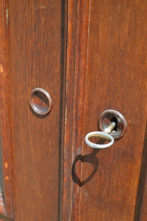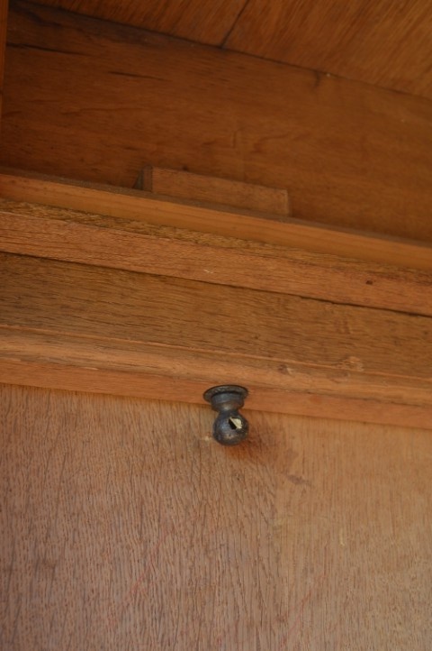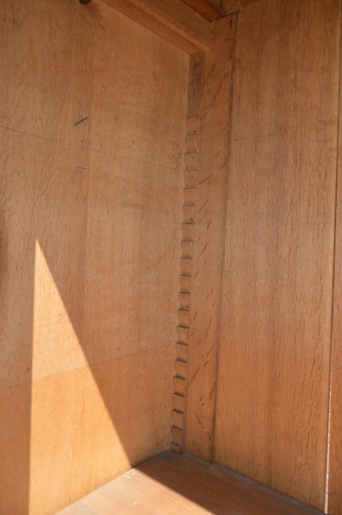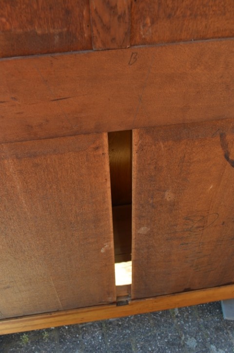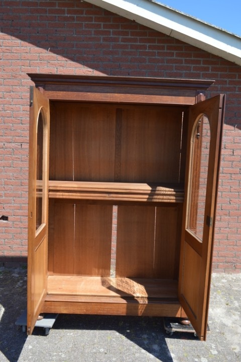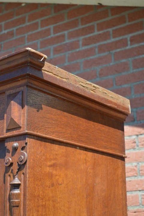 Een mooie, zeer ruimte economisch, grote kast met gebruikssporen, die opknapwerk en liefde nodig heeft. De schappen dragende latten zijn verdwenen. Een stukje van de lijst is weg en een een stuk lat van de achterwand eveneens.