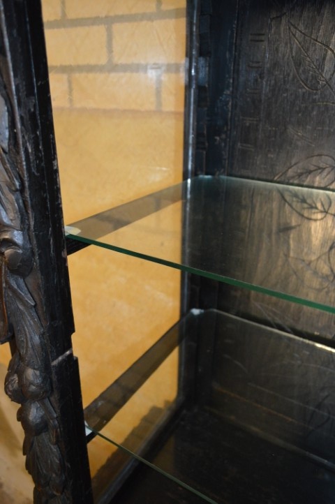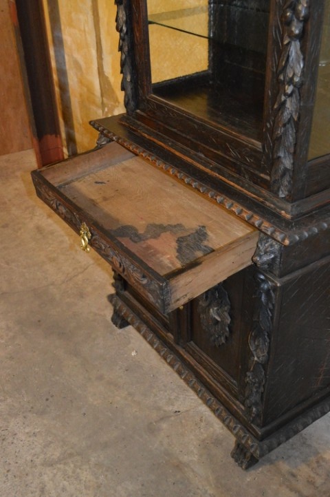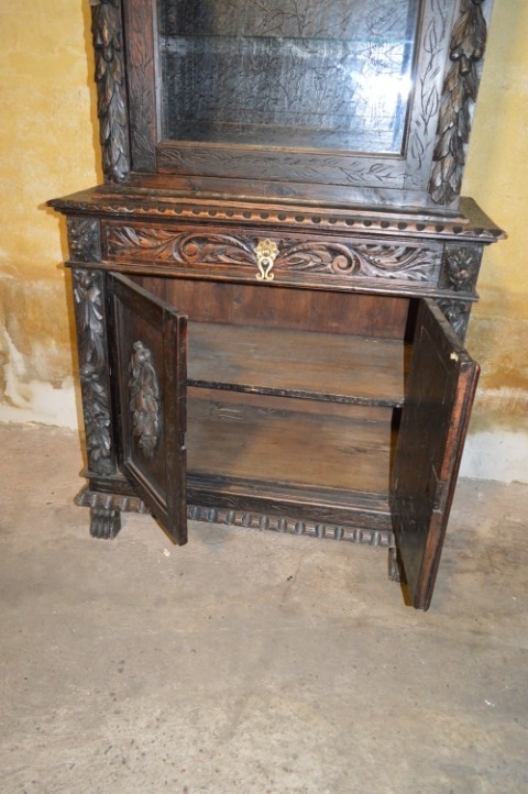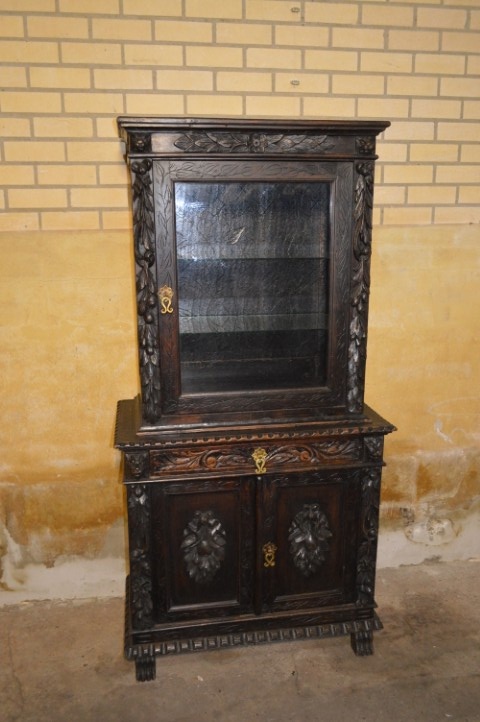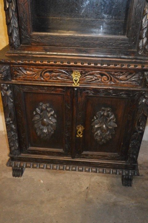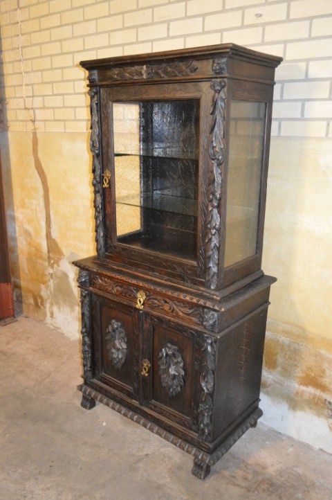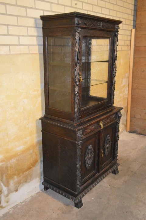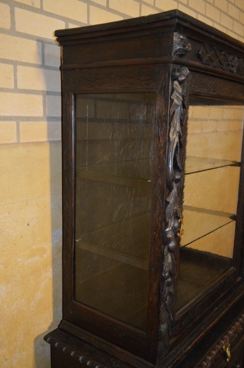 De kast bestaat uit twee delen. De bovenkast heeft een vitrinedeel met niet-originele glazen schappen die echter zeer mooi aansluiten bij het geheel. De onderkast heeft een dubbele deur met één binnenplank en daarboven een praktische lade.