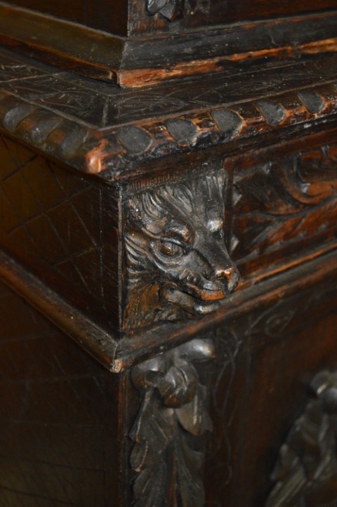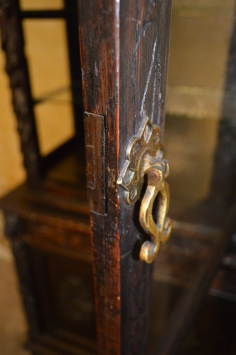 Natuurlijk zijn er gebruikssporen aanwezig – passend bij de leeftijd van dit meesterlijke meubel. Het beslag is niet origineel, maar vormt een stijlvolle aanvulling. De originele sloten zitten nog in de deurtjes; de sleutels ontbreken. Wie latjes in de bovenkast aanbrengt, kan de schappen bovendien eenvoudig in hoogte verstellen. Een zwaar, solide en karaktervol stuk dat zowel sfeer als kwaliteit uitstraalt.