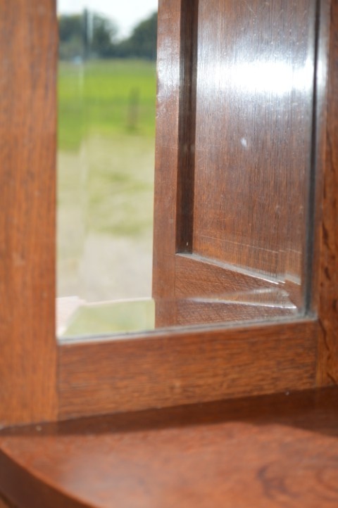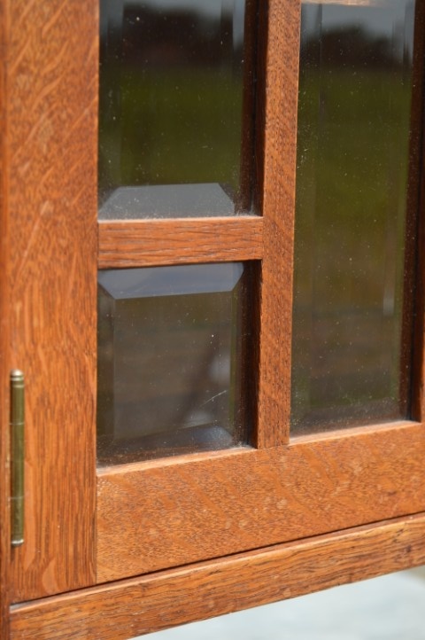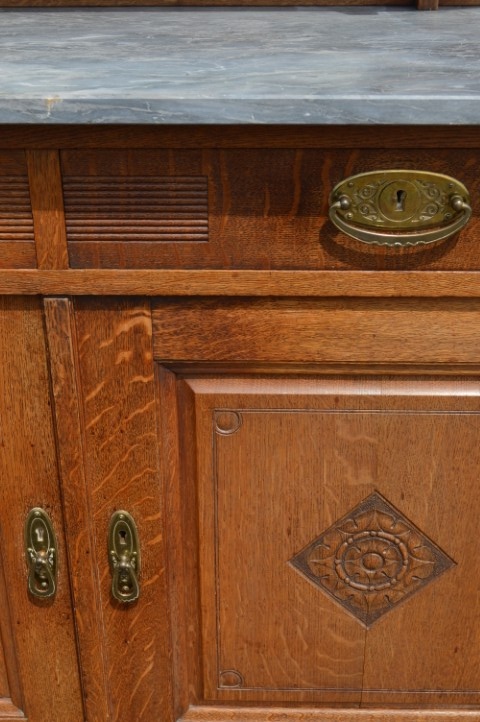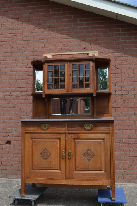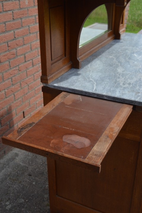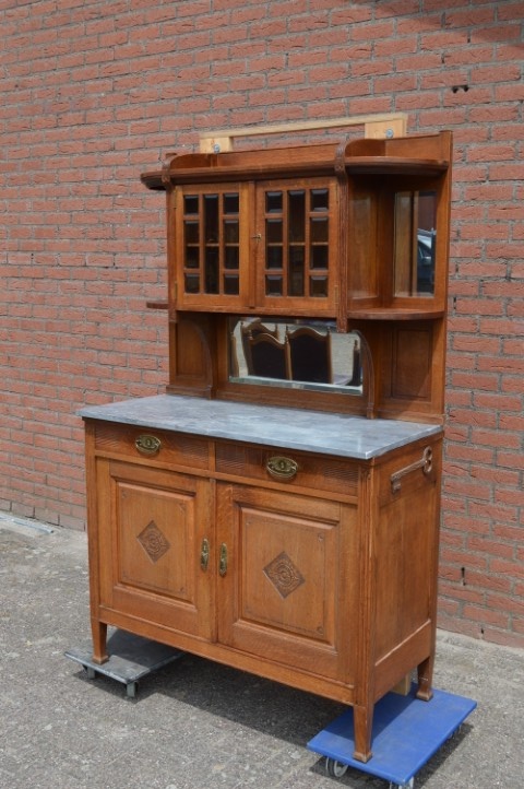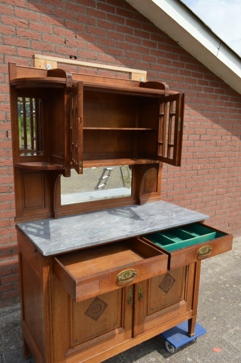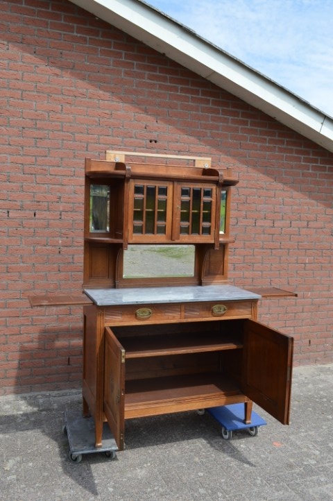 Deze antieke eiken kast met natuursteen blad is een sierlijk en functioneel meubelstuk. Het bovenkastje is voorzien van facet geslepen spiegels aan weerszijden, en ook in de deurtjes van de bovenkast vind je facet geslepen glas. Aan de zijkant zit een charmant uitschuifbaar snijplankje, wat deze kast extra bijzonder maakt. Boven de onderkast zitten twee laden, een die duidelijk de besteklade is en de andere voor de kleine prutteltjes die altijd overal rondslingeren. Onderin bevindt zich een diepe opbergkast, ideaal als servieskast of voor ander keukengerei. Zoals bij veel antieke meubels zijn er duidelijke gebruikssporen zichtbaar en ontbreekt de sleutel. Dit maakt de kast echter niet minder karaktervol – integendeel: het draagt bij aan de authentieke uitstraling van dit veelgebruikte tweedehands meubel.