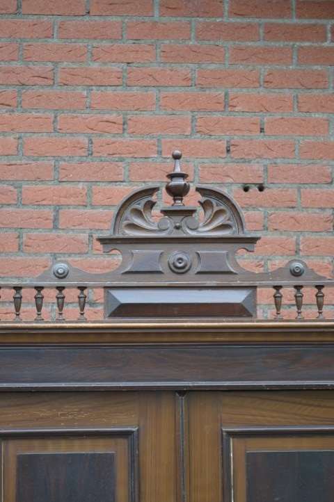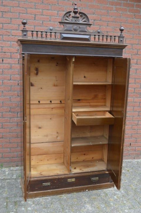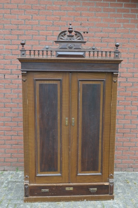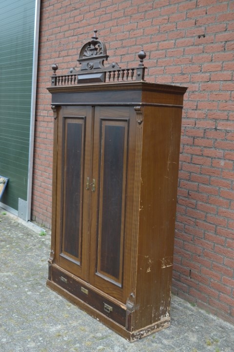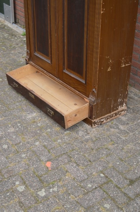 Antieke jaren 20 art deco kast met mooie kuif. Een oud grenen kast met twee openslaande deuren. De tweedeurs kast is gemaakt als hang - legkast met aan de linkerkant een hanggedeelte met boven en onder haken en aan de rechterkant drie legplanken waarvan 1 een lade heeft. Onderin de kast is een grote lade. Een kast met veel mogelijkheden om te gebruiken. Bijvoorbeeld als kledingkast, servieskast, speelgoedkast of kantoorkast te gebruiken. Deze strakke kast kan nog jaren voor veel opbergplezier gaan zorgen.