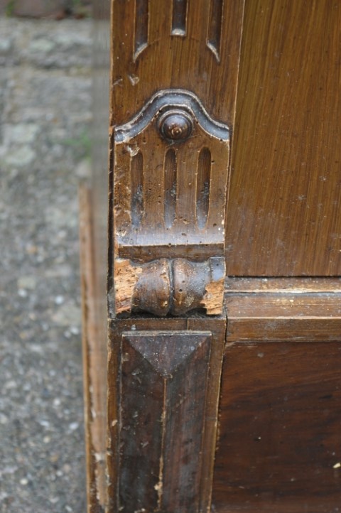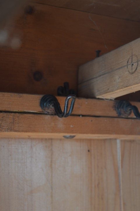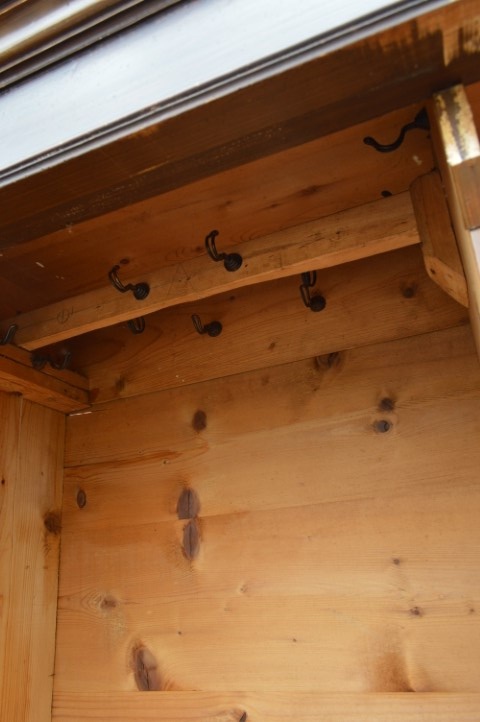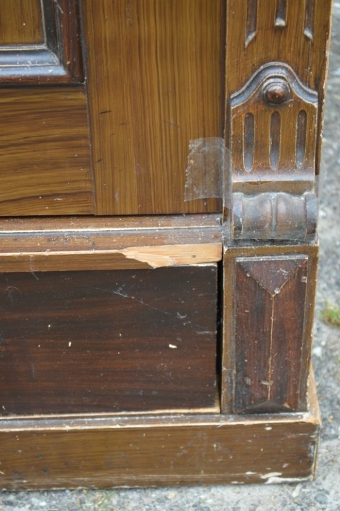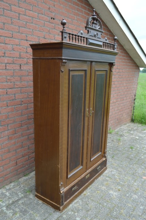 Deze houten kast heeft gebruikssporen zoals zijn leeftijd betaamd. Hij is behandeld tegen houtworm en 1 deur is wat krom getrokken.